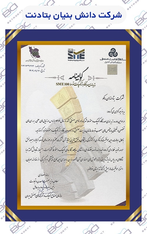 در این ارزیابی جامع که با حضور صدها بنگاه صنعتی از استانهای مختلف کشور انجام شد، شرکت بتادنت موفق شد با کسب جایگاهی ممتاز، در جمع10 شرکت برتر ایران قرار گیرد.