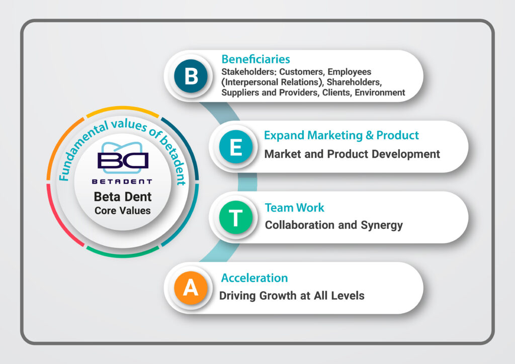At Beta Dent, we believe that only by relying on clear core values and a coherent philosophy can we achieve progress and sustainability in today’s fast-paced and complex world. These values are not only our guide in decision-making and strategy development, but also a source of inspiration for all team members and our business partners. The company’s core values are derived from the letters of the word BETA, creating a lasting and standard framework that resonates with the entire team.