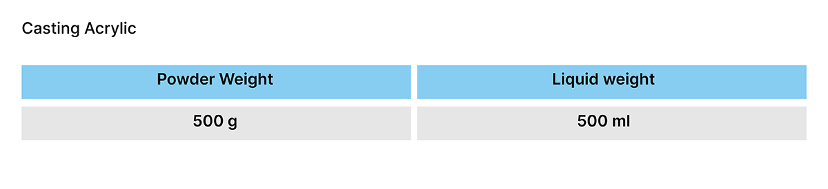 The casting acrylic is formulated with PMMA powder and organic fillers, combined with polymeric nanoparticles to enhance mechanical properties such as strength and flowability. The powder also contains an initiator and pigments. The casting monomer is composed of MMA, reactive amines, and cross-linking agents. Acrylic pouring is used for the fabrication and repair of gingival prostheses. This low-viscosity polymer is poured into flasks and polymerized under pressure at 55 °C in a pressure pot.