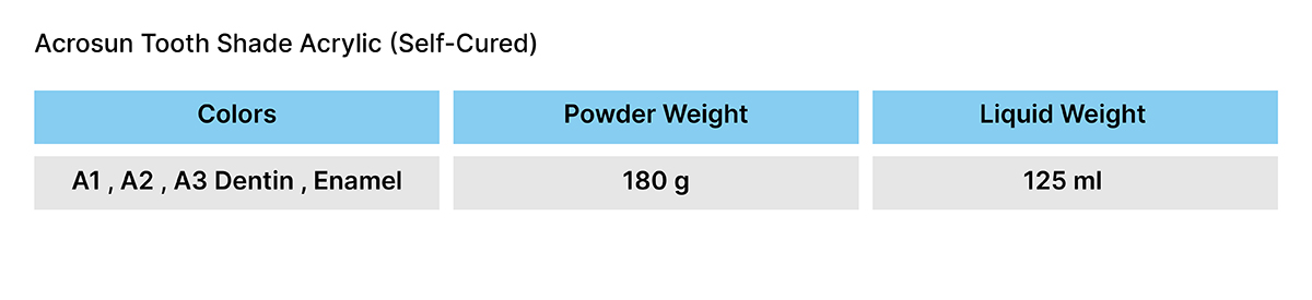 This self-curing tooth-colored acrylic powder is made of high molecular weight PMMA with particle sizes under 60 microns. Initiator and stabilizer are included in the powder, while the monomer contains a catalyst to accelerate polymerization. Recommended mixing ratio: 10 g powder to 5 g monomer.