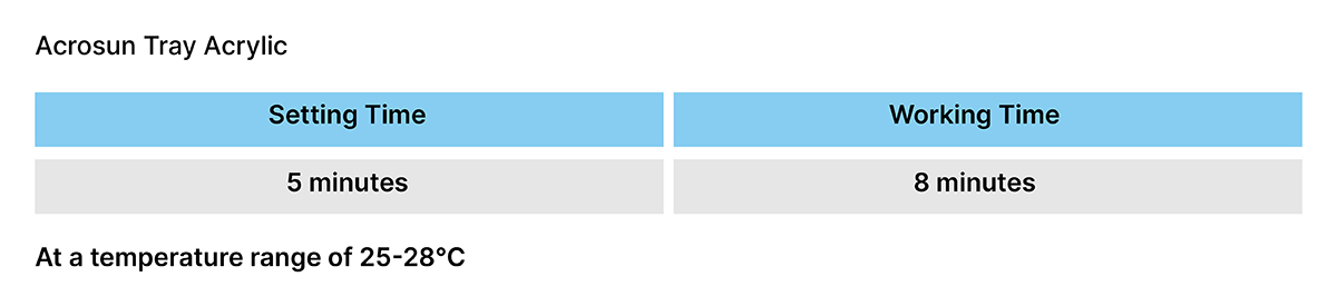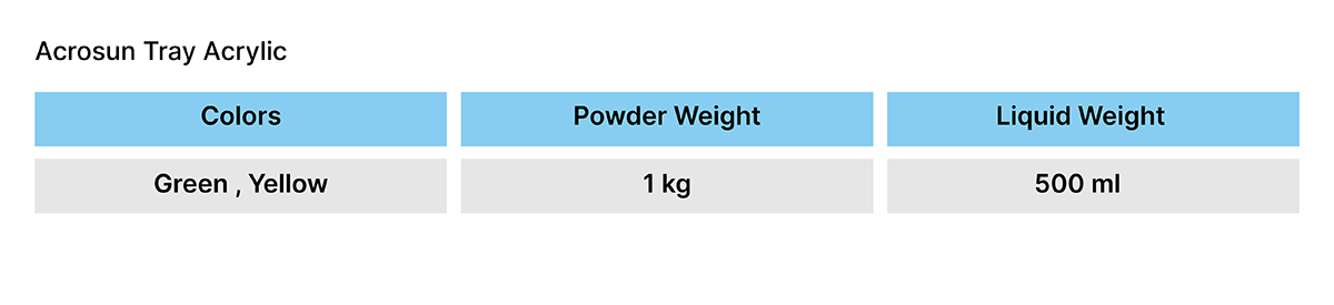 The tray acrylic consists of a powder and liquid system. The powder contains PMMA, inorganic fillers, and an initiator, while the liquid monomer contains MMA, a plasticizer, and reactive amines. The curing system is self-polymerizing. The prepared polymer mold is easy to shape and, after polymerization, provides excellent dimensional stability and accurate reproduction of impression details.