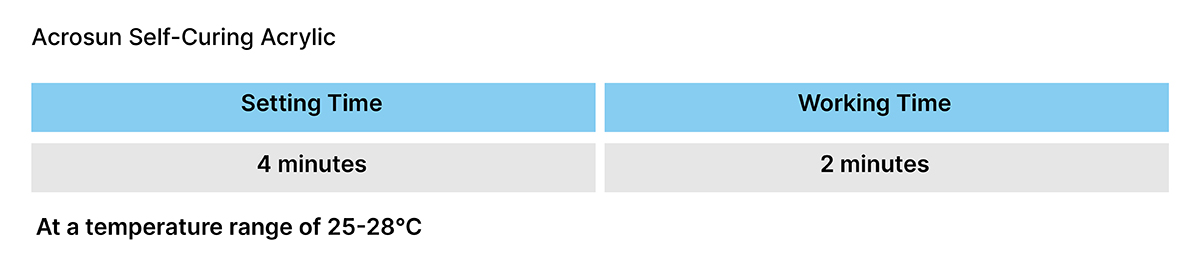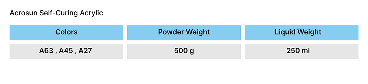 The self-curing acrylic is made of a powder (PMMA) and a liquid monomer (MMA). The powder contains a catalyst to accelerate curing, while the liquid monomer contains a reactive amine to initiate self-curing polymerization without direct heat.